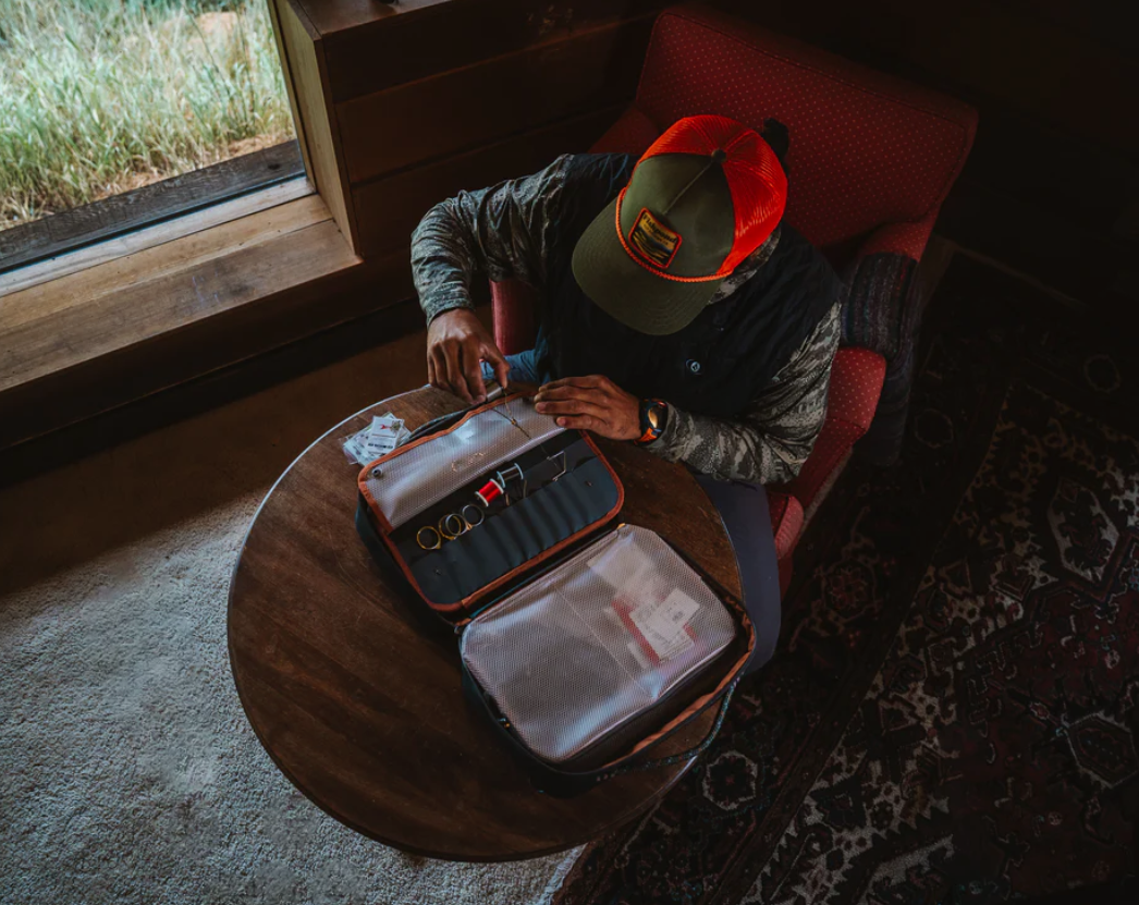 The Backwater Fly Tying Kit packs smart organization into a compact footprint that slips easily into carry-on or checked luggage. Two large see-through pouches keep materials visible and tidy, while a padded interior pocket with a stretch sleeve secures your pedestal base and vise heads. A streamlined hypalon tool page offers quick access to everyday essentials without wasting space or tearing up your delicate tying materials. Load up, zip up, and tie wherever the trip takes you.